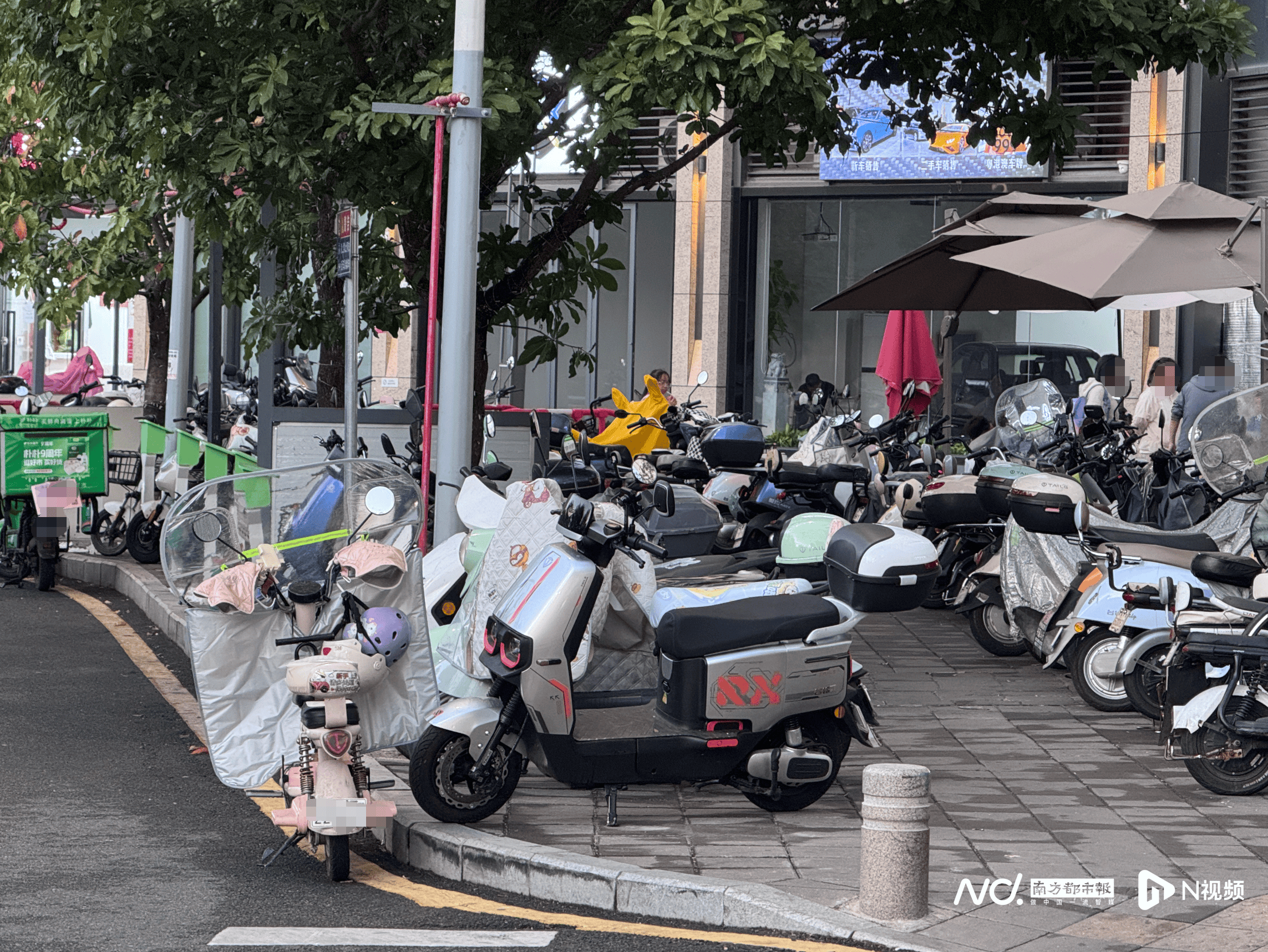 人行道上电动自行车停放密集,不仅盲道被占据,部分区域仅能勉强容一人通行。虽然社区设置了“规范停放”提示牌与黄色停车线,但随意停放现象仍普遍存在。道路周边有幼儿园与中学,上下学时段交通尤为混乱。