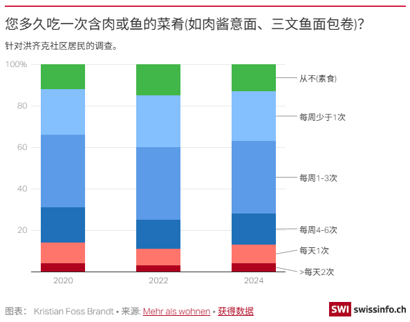 在洪齐克社区,理想与日常习惯常有冲突。例如减少肉类摄入虽是降低个人碳足迹最有效的方式之一,但社区居民中少肉或无肉饮食者的比例却略有下降。