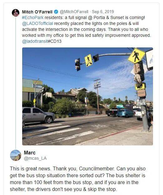 图四、洛杉矶交通部官员:“居民们:我们过几天就有一个新的交通灯了。安全第一。” 图源:推特
