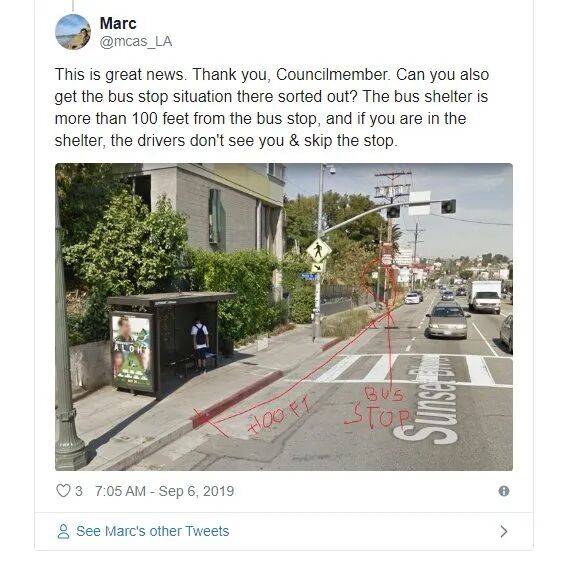 图五 (接上图)“太好了,你能否顺便也解决一下旁边公交站的问题?公交牌离等车的地方有三十多米远,你要是在公交休息区等车,公交司机就看不见你,也不停车。” 图源:推特