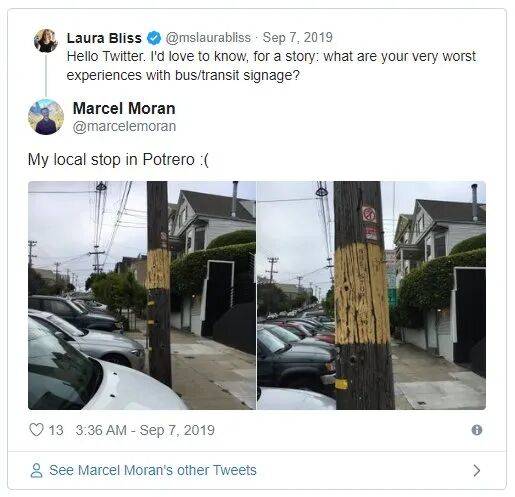Moran发现,整个旧金山只有大约三分之一的公交车站有遮挡棚和候车座位。同样有大概三分之一的公交车站被沿街停放的车辆所阻碍,常常迫使乘客在停放的车辆间穿行然后在街上乘车。公交车站的站牌在样式和易读性上差别很大——最常见的一种是在金属杆子上用涂料作标识——同时还有11%的车站似乎完全缺乏易读的标识。
