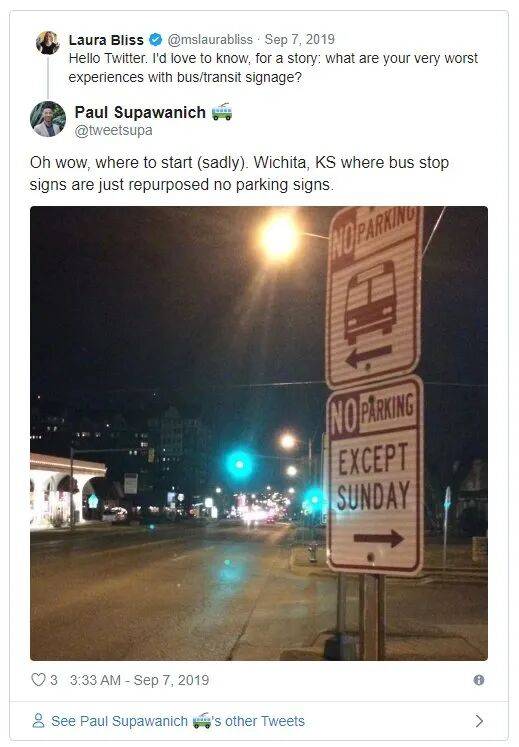 图三、“从哪说起呢,威奇托的公交站牌就直接征用了附近的禁停标志。” 图源:推特