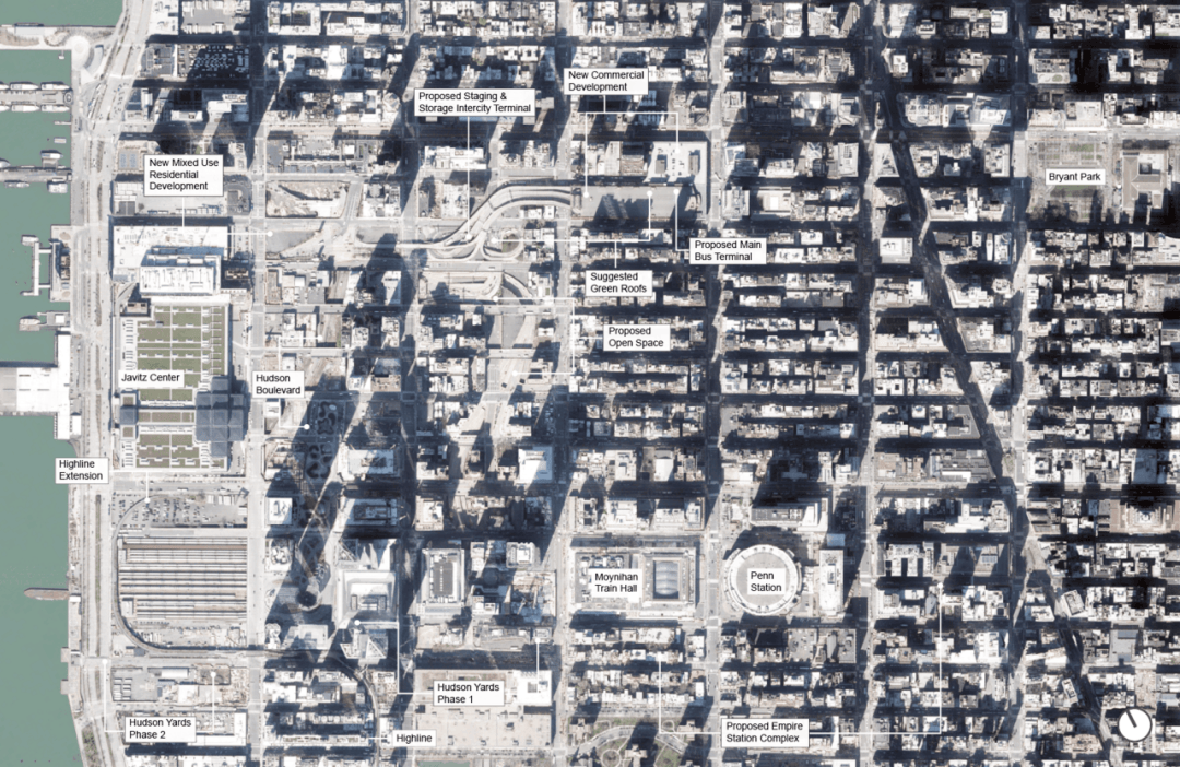 1. 利用新枢纽的屋顶。新的巴士枢纽站提供了一个契机:可以在部分或所有建筑综合体的屋顶上建造面向公众的开放空间、绿地、或其他屋顶用途。按照当前的提议,新巴士枢纽站和其附属的建筑结构的屋顶将包括约4万平方米(10英亩)的开放空间,相当于一个布莱恩特公园(Bryant Park)或华盛顿广场公园(Washington Square Park)的面积。此地建造的塔楼可以方便人们来到这片屋顶空地。