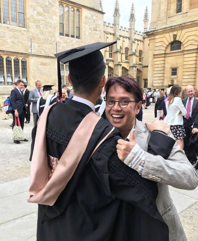 他会不远万里飞到英国参加儿子的毕业典礼,穿着儿子的硕士袍拍照,笑得合不拢嘴;
