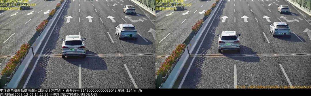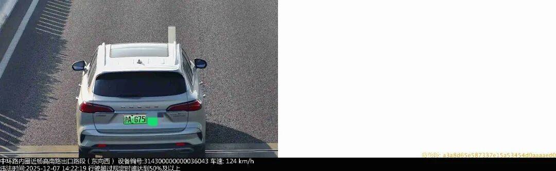 2025年12月7日14时22分,号牌为沪AG75*** 的小型普通客车在中环路内圈近杨高南路出口路段(东向西),实施了“驾驶校车、中型以上载客载货汽车、危险物品运输车辆以外的机动车在城市快速路上行驶超过规定时速百分之五十以上且时速未超过一百五十公里的”违法行为。