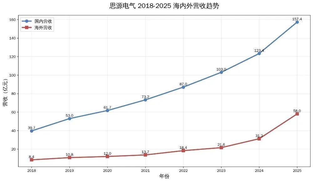 2018年,思源电气的海外营收为8.4元亿,营收占比为17.47%。多年来,思源电气的海外业务稳步增长。到了2025年,其海外营收已高达58.03亿元,同比增长85.84%,占比提升到了26.94%。海外成为第一增长曲线,增速远超国内。
